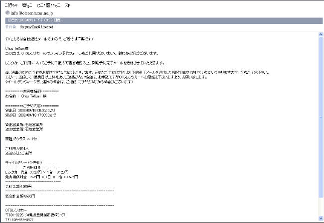 石垣島的行程我們租車趴趴走的方式,9/1先在台灣跟OTS預約租車(唉呀~預約流程忘了留紀錄了),之後會收到一封日文E-mail確認信。