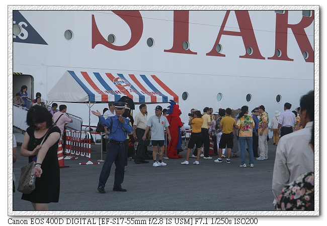 七點多出關,居然沒有排很久的隊,小羽媽本來都做好心理準備,少說又要再排個半個鐘頭以上,可能是昨天已經入進日本,所以沒有太多的檢查,只有刷刷船卡確認你有出門。今天"離船玩物"是恐龍與Pirate,小羽很喜歡跟玩偶拍照,所以這裡有拍一張(後來一共買了兩張,一張是在基隆登船的鴨子,另一張就是恐龍)。小羽害怕Pirate(原因是~~~Pirate有鬍子~~~ㄟ,小羽爸也也有鬍子)。石垣島的"離船玩物"是日本藝妓,小羽不喜歡所以就沒拍了(其實是在睡覺~)。