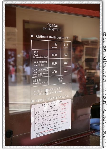 進入之後,迎面而來是主殿,也是待會要參觀的地方。主殿的廣場有很多團體在這拍團體照(沒帶腳架~失策~)。參觀入口是在旁邊的南門,需脫鞋入內,每人給一袋子裝脫下來的鞋子(之後也會回收袋子),動線也安排的不錯。裡面每個參觀說明都有中文(還是繁體的喔~),裡面服務人員也很多(可能怕你亂搞),且服務人員都穿古裝。只是內部沒有空調(該不會是響應環保減碳吧?),天氣有點熱。比較機車的是~~~裡面不准拍照~~~天哪~那我帶相機幹嘛~~~