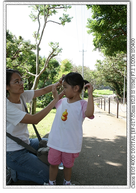 整個逛完約莫花費一個鐘頭,就步行到電車站。沿路小羽也是嚷嚷流一身大汗(跟三歲小孩出門很恐怖~~~) ,小羽媽只好幫小羽綁辮子(唉~標準都市小孩)。沿途經過藝術大學(只參觀門口)。
