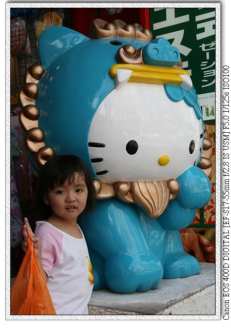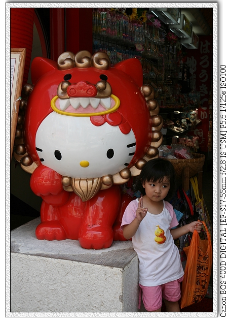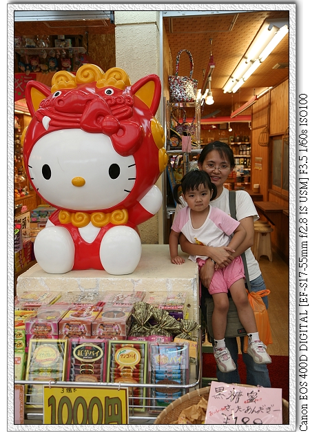 一路從國際通走到平和通,平和通裡有一家店,門口擺有一隻獅子裝扮的Hello Kitty(應該是獅子吧?),小羽看到就想跟Hello Kitty拍照。店家也很主動將Hello Kitty往旁邊稍移。這個舉動導致我們在這家店買了不少東西~(都是小羽要送給同學的餅乾) |
