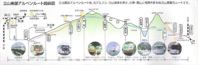 立山黑部阿爾卑斯山脈路線,是亞洲唯一的山岳遊覽勝地,貫穿日本屋脊的立山黑部.阿爾卑斯的連綿山峰,整個行程須乘坐六種交通工具,遊客可達最高點"室堂"海拔2450公尺,直到六月中左右海拔3,000以上之峰仍有多處積雪。