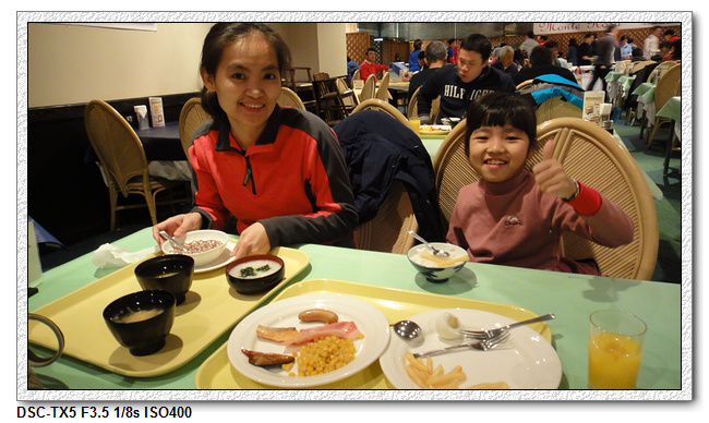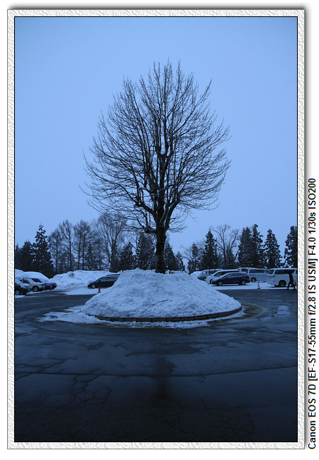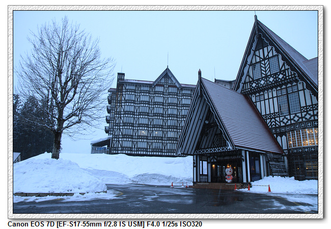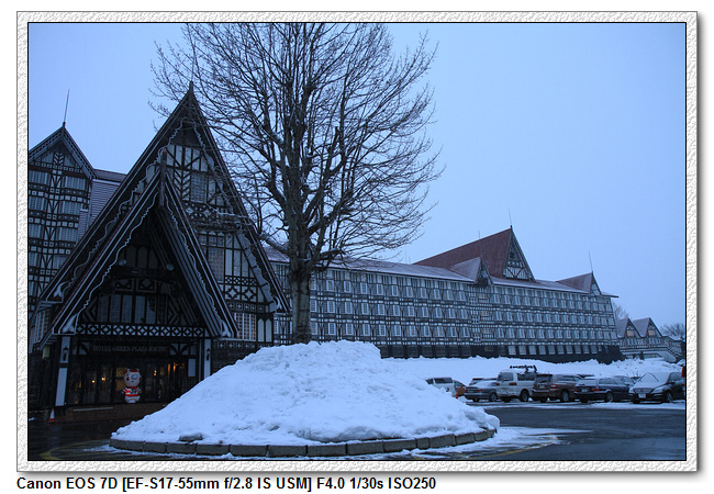 在這裡,小羽爸可是難得的早睡早起,一早 6:00 就起床。赫然發現外面正飄著小雪。昨晚天色不好沒拍到飯店的景象,一早補回來。