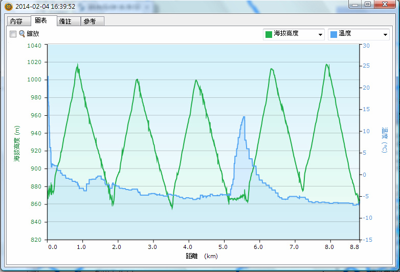 還特別帶了溫度計去測量,其實室外最低也才零下2度左右,在脖子、臉的包得緊緊的情形下,即使只穿一件高領的衣服+gore tex外套,身體也感受不到寒意,