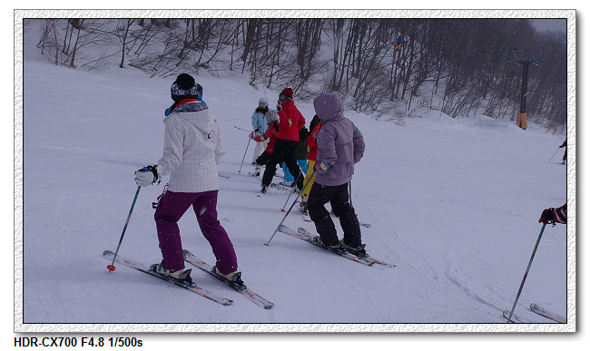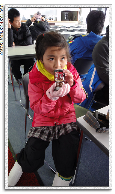 休息時,剛好遇到中階班到餐廳喝熱可可暖手,小羽媽因此跟著小羽、小羽爸,後面跟著中階班多滑了兩趟, 其中第一趟中階班的教練有幫忙錄影, 中階班練習併腿轉彎,小羽媽就全制動轉彎, (還好小羽媽有跟著小羽多滑這兩趟,感覺這是這次滑雪唯一比較正式的指導)。