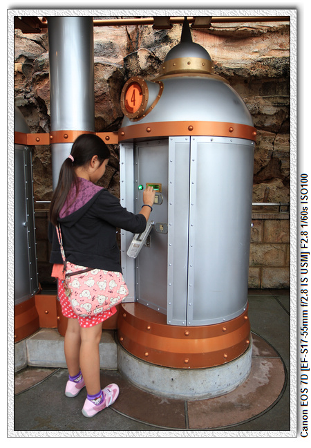 地心探險類似於飛濺山,只是飛濺山最後是高速衝向水面激起水花,而地心探險是觀賞玩地心場景以及怪物之後,也是高速衝往一個黑暗洞穴,最後是在黑暗中高速滑行。 小羽排隊時跟昨天一樣,一直碎念說好恐怖,為什麼要來玩這個。玩完之後,小羽還是覺得很恐怖。