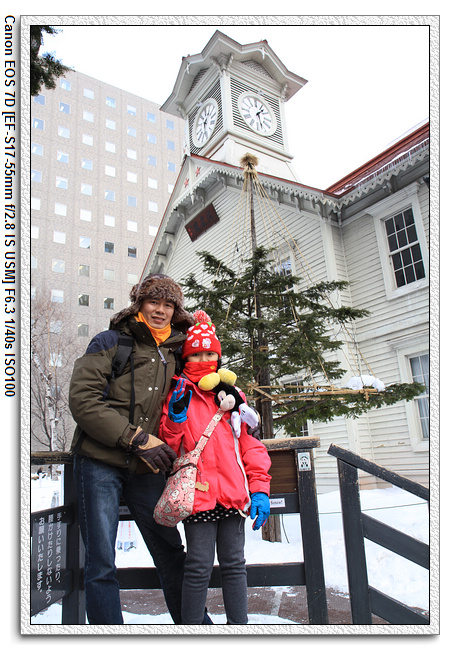 時計台就在午餐附近,轉個彎就到了。札幌市時計台,是日本北海道札幌市的著名地標,亦是北海道少數保存至今的美式建築,為日本19世紀引入西方教育以及北海道開墾時期的象徵,現已列為重要文化遺產,與北海道廳舊紅磚廳舍同為札幌市中心的主要觀光景點。其正式名稱是「舊札幌農學校演武場」,俗稱「札幌鐘樓」,或簡稱為「鐘樓」(時計台)。
