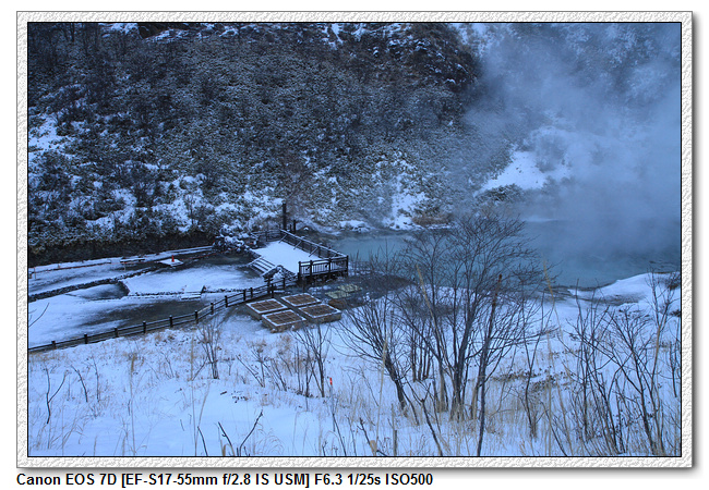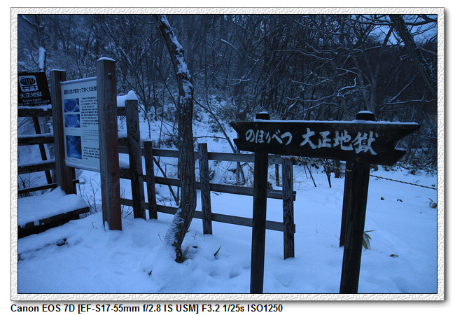 大正地獄是大正時代小型火山爆發時形成的周長為10米左右的池沼。它的溫泉水量成週期性反覆增減,最近有時還會突發性噴發出溫泉泥。此外,它的泉水顏色會週期性變化成灰色,綠色,藍色和黃色等7種顏色。天色已暗,只看到一種顏色。