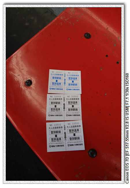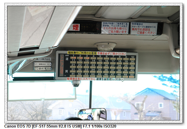 這兩次搭公車,大概了解日本公車的計費方式,就是上車前先拿整裡劵,整理劵上有號碼,就是你上車時站牌的代號,公車前方有個標示車資價格的大表格,下車時就對應表格上的車資,就是應付的金額。