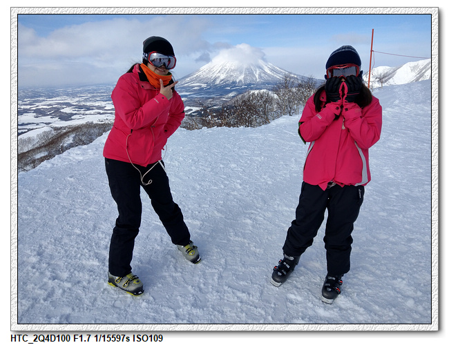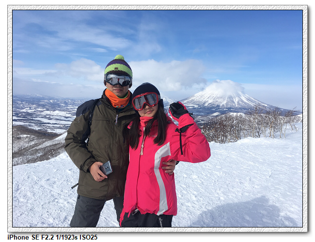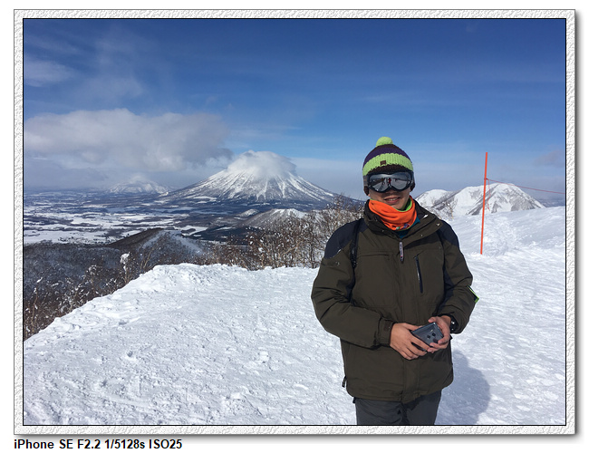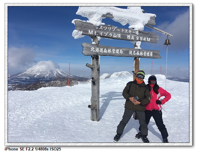 今天天氣不錯,山上的風景很漂亮,後面的羊蹄山可以拍的很清楚。但,下山就考驗小羽媽了。小羽爸先下坡,小羽居然是一路側滑下坡,小羽媽則是很慢很慢的滑下去,沒有摔倒的狀況下安全度過最恐怖的一段,之後算是很平順地按照小羽爸昨天想的路線,ISOLA