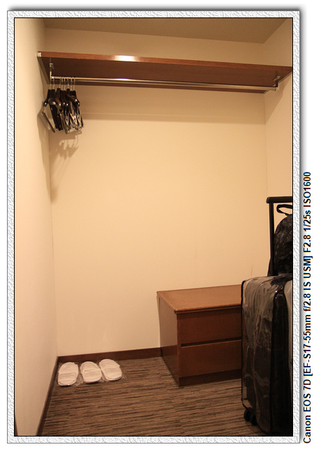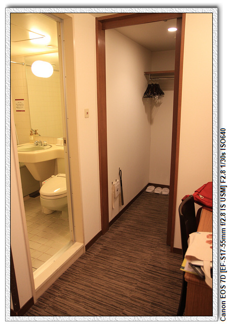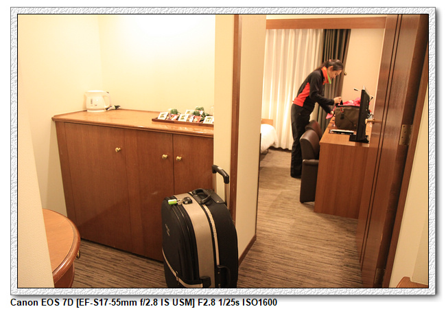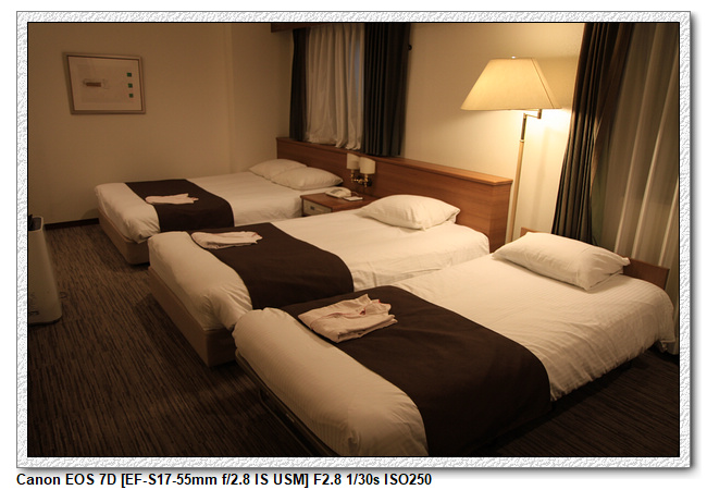 旅館最讚的是有很剛好的梳妝台,可以用來坐著吹頭髮、小羽戴角膜塑形片,有很棒的置衣間:可以平放兩個大行李箱。有三張床,其中有一個是小小加床,房間電燈很亮,還好有註明要無菸房,一出房間,七樓的走道,一整個是恐怖無法除去的煙味(隔天就好多了)。
