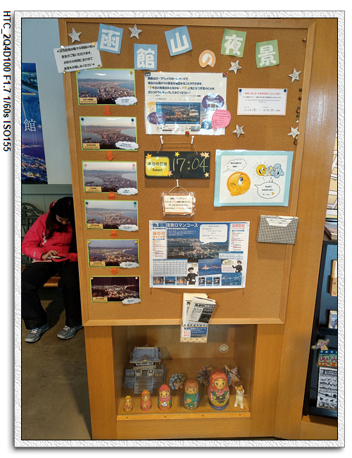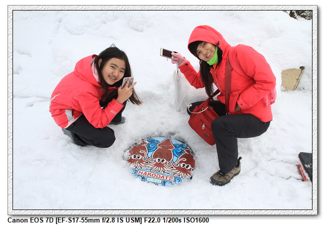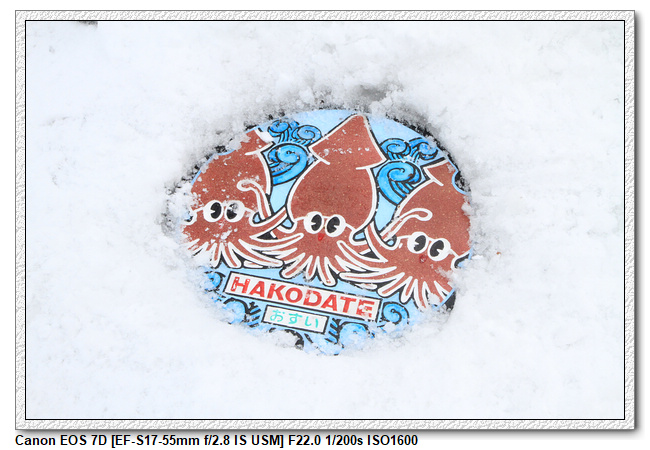 忘了在哪個景點時,有特地介紹函館的路面上的創意,傳達出城市的特色以及歷史文化的水溝蓋。函館的水溝蓋上繪製了許多代表著函館市的彩繪造型圖案,包括代表函館市的烏賊以及國家古蹟五稜郭等等。不過這些彩色水溝蓋設置的時間是4月開始到11月中旬。因為在降雪季節中水溝蓋會被雪覆蓋住,而在除雪的時候會傷到水溝蓋的表面,所以冬天的時候會換回黑色的造型水溝蓋。