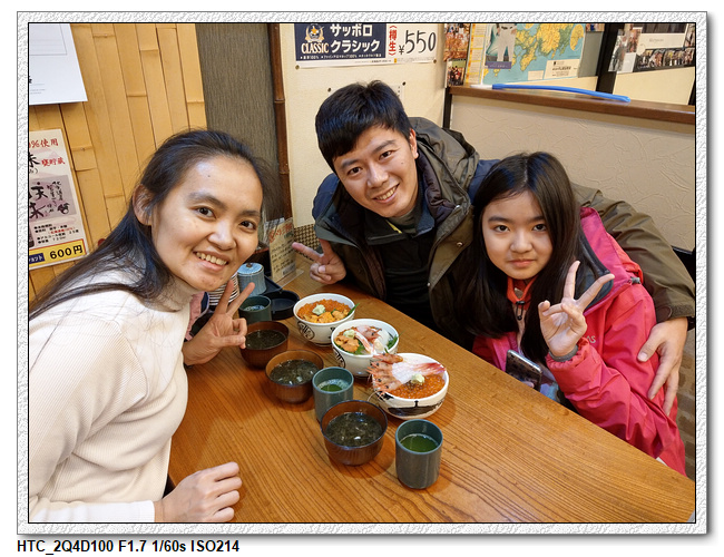 小羽這次換了一家店,小羽選了有甜蝦+鮭魚卵的丼飯,小羽媽五色丼飯,小羽爸海膽+鮭魚卵丼飯,一樣附有紫菜湯+抹茶(小羽不愛抹茶,一口都沒喝)。