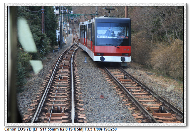 登山纜車從標高差211公尺的強羅車站到早雲山站之間,一口氣直線攀登上山,全程約1.2公里的距離,所需時間大約10分鐘。從電車最後方的座位俯瞰下方,可以清楚看到陡峭的急坡面,一覽無遺。