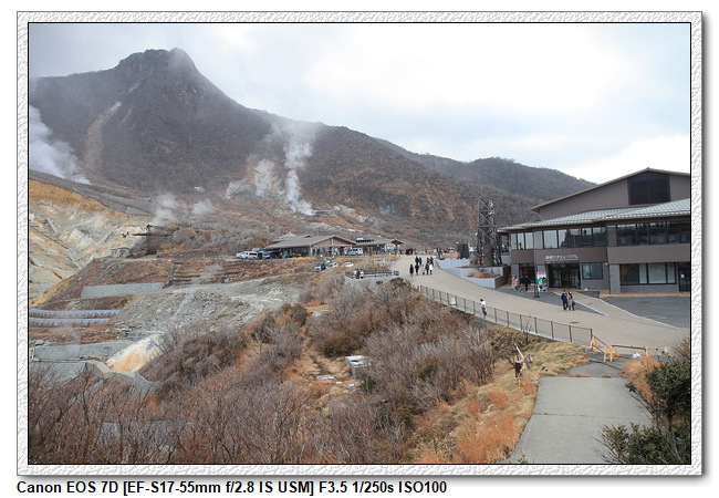 「大涌谷」是箱根中央火口丘組成之一「冠ヶ岳」的北側斜坡大約標高800m到1000m處,遍布巨岩、蒸氣和硫磺煙,是箱根火山中最大的噴氣地帶。