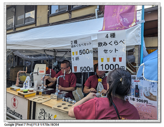 這條封街市集,很多人手拿啤酒,有手拿一杯啤酒的,也有一次拿四杯啤酒的(有紙板盛載),這條街似乎賣啤酒比賣吃的還多,小羽爸對於紙板四杯啤酒很有興趣,就找了一家啤酒看起來很特別的店。 這家也是四杯1000円,四杯不同的啤酒,四種酒分別是京都麥味(抹茶)、丹波の黑豆、黃櫻 LUCKY CAT 白愛爾、京都麦酒・蔵のかほり。 老實說,現在回想口感好像也想不起來,只記得抹茶的啤酒似乎有一點抹茶口感,黑豆的有點像是黑啤酒的口感。