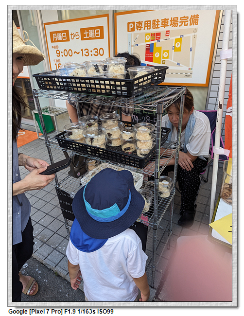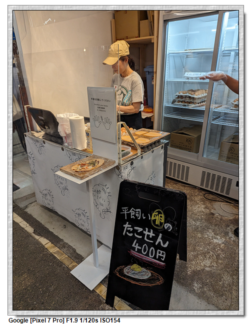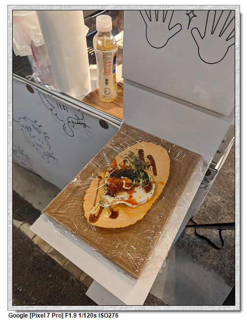 亂走亂逛,酒到一條小吃街,有家小商店,看起來像是臨時擺攤的攤位,賣的商品是 たこせん ,外表是脆脆的餅乾、裡面有荷包蛋、一些配菜跟美乃滋。吃起來超美味, 脆脆的外皮餅乾+半熟蛋,還有一些美乃滋混搭的口感,當下立刻加買一個。現在想起來還是覺得很美味。