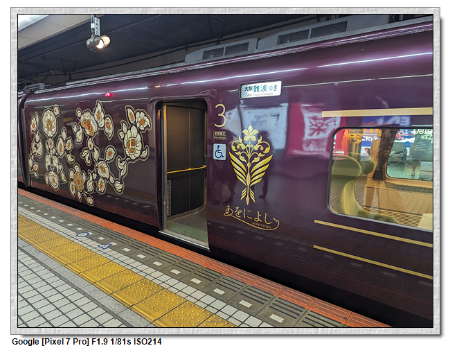 小羽家目前搭乘都是用西瓜卡(小羽跟小羽媽已轉iphone的電子卡,小羽爸還是用實體卡),到目前為止都是車來就上。這次要前往難波站(なんば駅)時,也是車來就上,但一上車後就覺得這車廂好高級, 甚至於比新幹線的車廂還高級,感覺不對就趕緊下車。查了一下,是號稱近畿最美列車,近鐵最新觀光特急電車 あをによし(AONIYOSHI)。