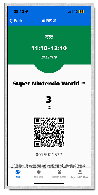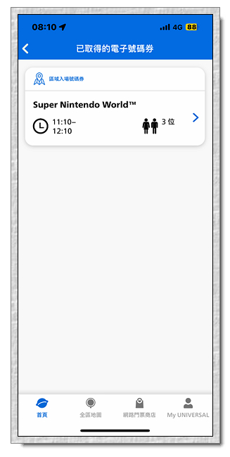 進入影城後,趕緊將三張電子票QRCODE登入到小羽手機裡,然後先抽超級任天堂世界的入場券,抽到入場時間是11:10~12:10。為何有快速通關來要抽入場券,因為我們想知道明天大概會抽到幾點,以及是不是有機會可以提早入園。