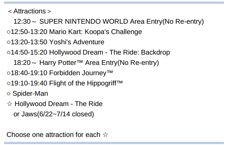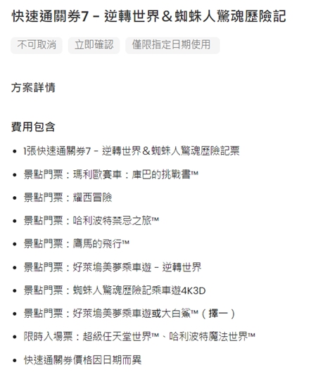 沒有提早入園券,也沒有任天堂保證入園券(也賣完),我們最後討論的結果,就買快速通關7,保證可以進超級任天堂世界以及哈利波特魔法世界(這個現在已經沒有卡人數了)。門票跟快速通關券都是在Klook購買的。 購買後很快收到電子票券,才發現快速通關的項目是有規定時間的,都被安排在下午。大阪環球影城今天的開門時間是08:00。