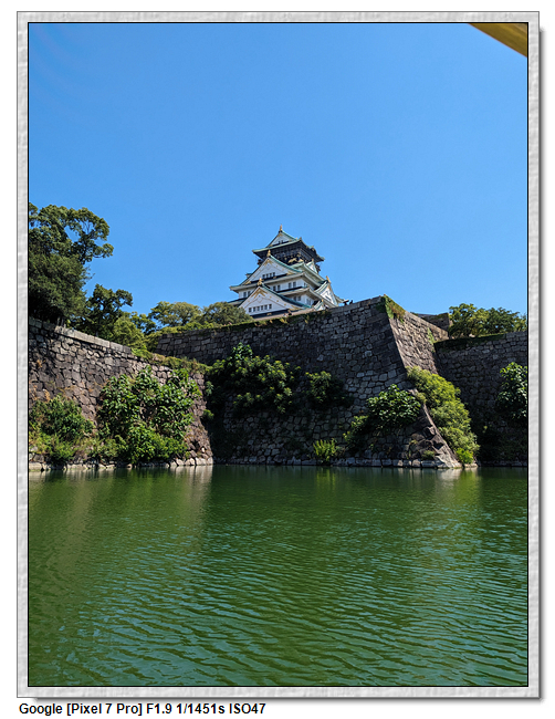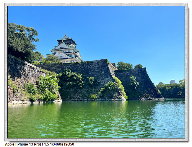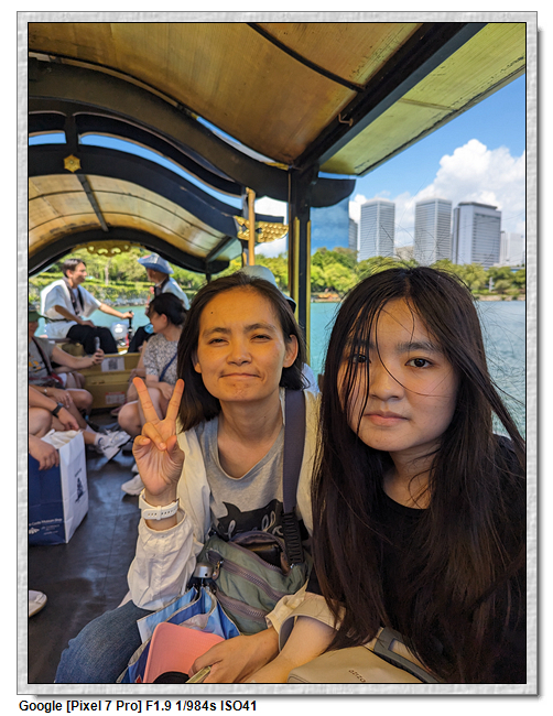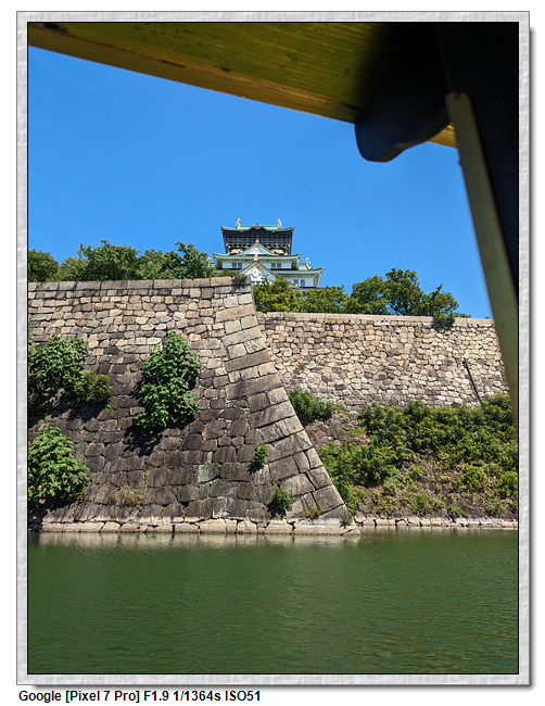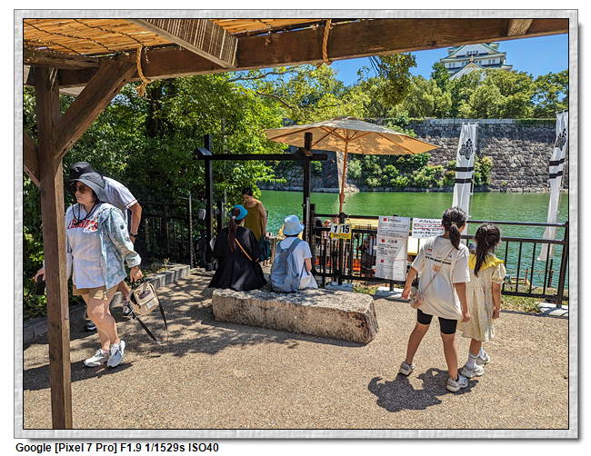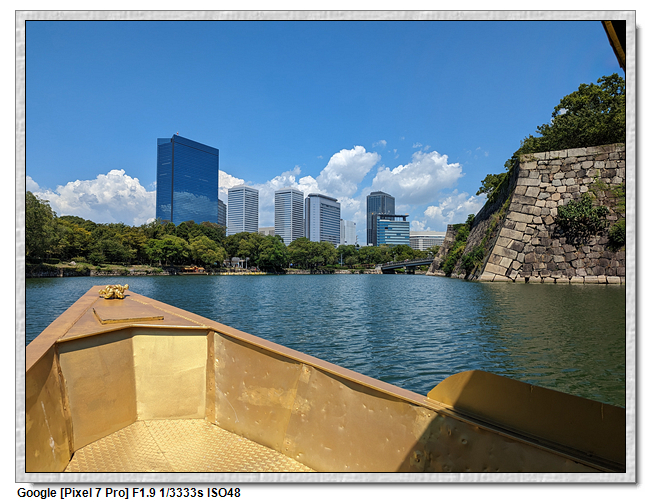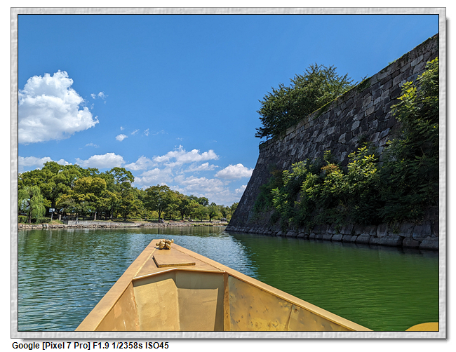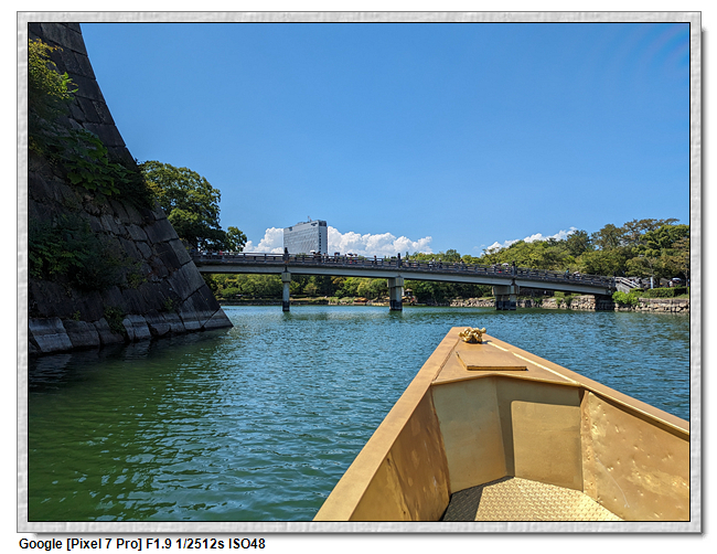 坐在船上遊覽內護城河,雖然有炎熱的太陽,但御座船緩慢的行駛帶來微風,稍微降低熱度,乘船時間約20分鐘,稍微可以舒緩最近爆酸的雙腳。