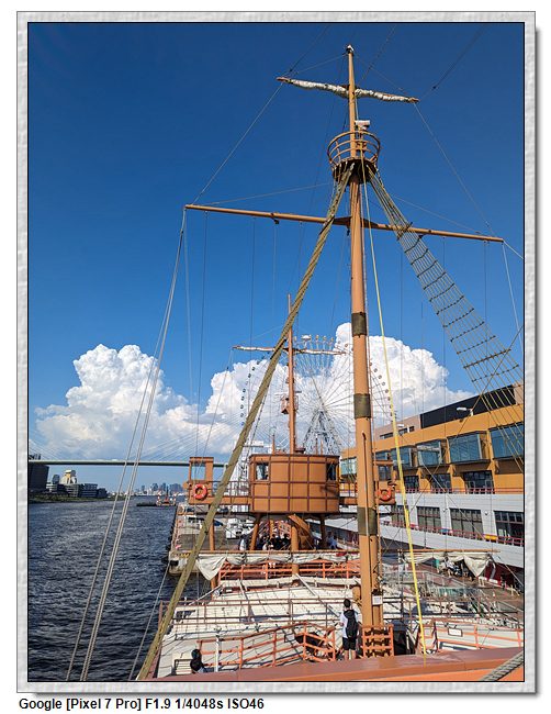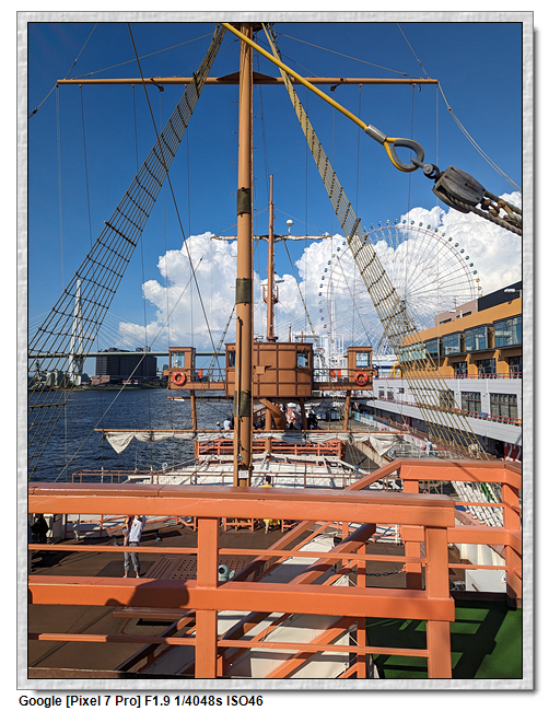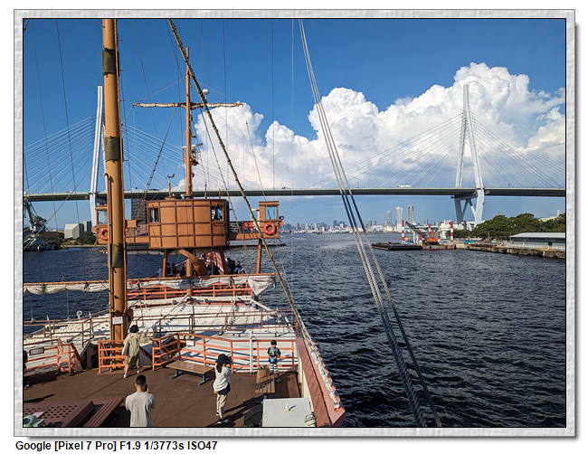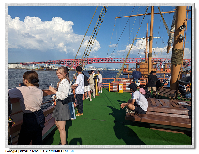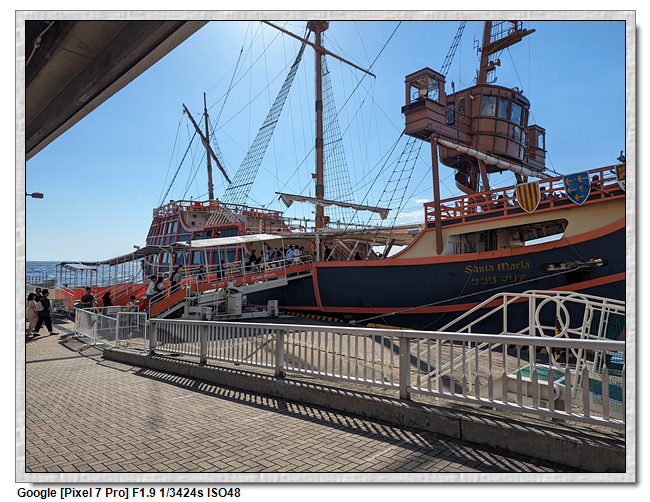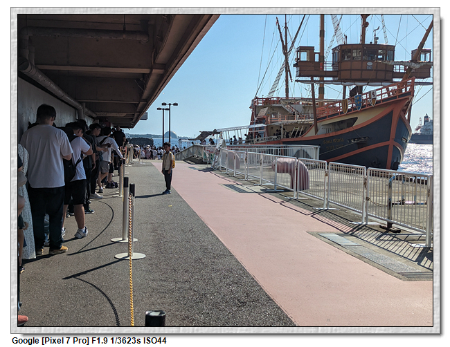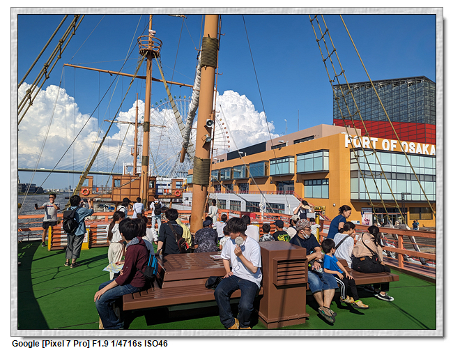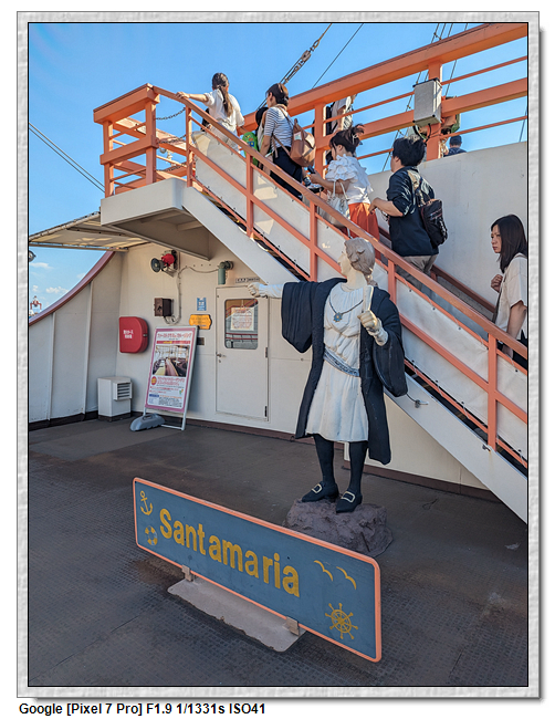 接下來又回到海遊館,這次要來搭乘帆船型觀光船 聖瑪麗亞號。這也是周遊券可以免費搭乘。我們抵達時剛好3點,前一艘船已經出發了,所以我們要等待4點的船班,依據門口的提示,持周遊券不用換票,但需提前15分鐘排隊。