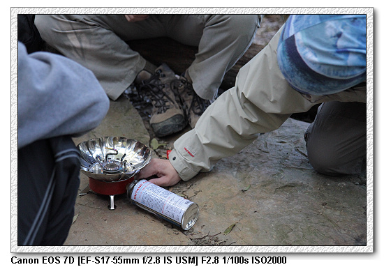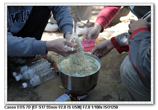 本來領先部隊想拋棄我們先攻頂,沒想到手套、爐子以及鍋子都在蝸牛部隊身上,所以只好停下來等。此時已有重大決定,下次伙食以及爐子鍋子等,要給健均及聖家背,然後他們要先上山煮好等我們,這樣時間才會剛好。(這應該不會太過份吧~剛剛好而已)