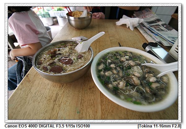 金門的蚵仔麵線很特別,跟台灣麵線的不一樣,屬於白麵。吃起來很像鹹粥口味,真的很特別,滿好吃的。麵線裡的蚵仔很多,又大顆,真的不惜成本啊~~~台灣麵線蚵仔都小小又少少。