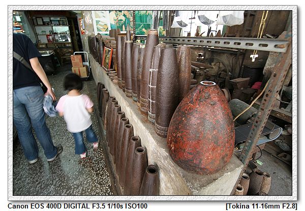 吃飽後閒晃,再逛完「邱良功母節孝坊」以及「觀音亭」之後,突然看到有間店鋪內有很多砲彈。雖然大家都知道金門鋼刀有名,但卻不知道所買的鋼刀是不是真的是用砲彈做的。