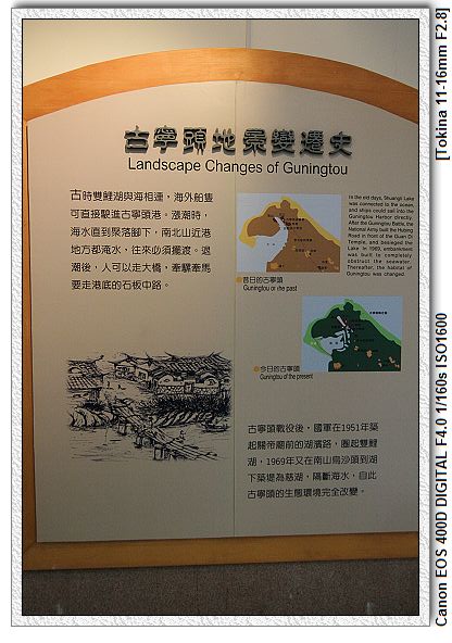 一樓大廳介紹古寧頭地區的人文史蹟、文化景觀以及地景的演變歷史,另有金門的地質、土壤、水文等資料簡介。