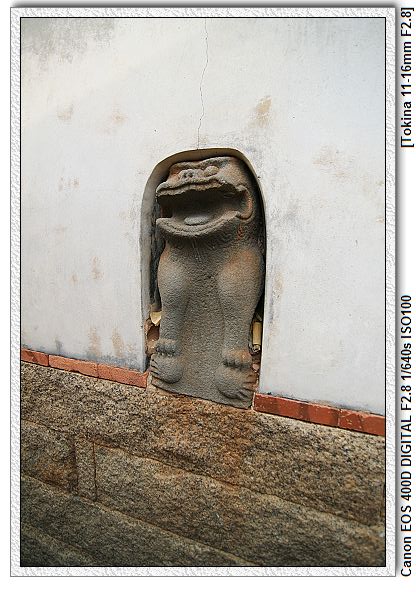 【瓊林蔡氏家廟後壁風獅爺,躲在屋後,不注意難發現(小羽做功課中~)】