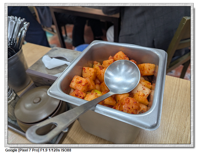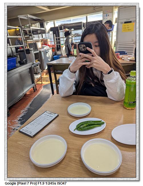 點完餐後,先上了三碗湯及一盤青椒,湯就像是沒玉米的玉米濃湯,算好喝,比較困惑的是那盤三根青椒,不知道要怎麼吃,我們一直偷看別桌怎麼吃青椒,結果很多桌都沒吃,直到有一桌終於把青椒拿起來直接啃。小羽爸也拿起來啃,不會很辣,就是微辣的青椒。
