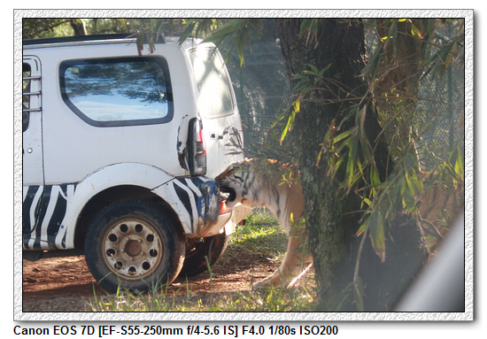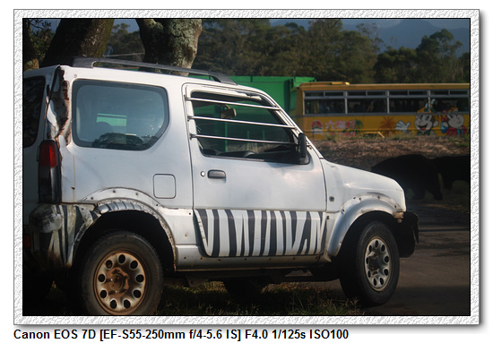 因為我們參觀的梯次是最後一梯,大部分的動物這時都要回家睡覺,而園區內ㄧ輛輛白色的吉普車,就是用來驅趕回家用的。解說 員有提到,因為白色吉普車會驅趕牠們,所以這些動物對於吉普車很反感,有時會做出攻擊的動作。