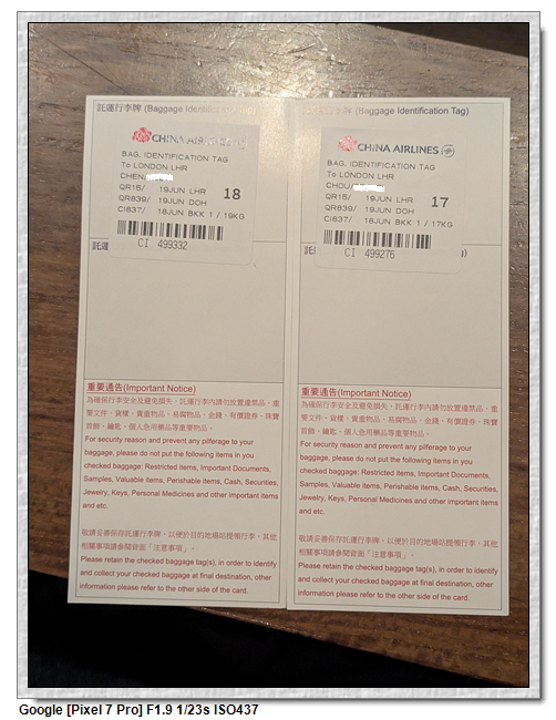 出發當天,使用信用卡附贈的接送機場服務,順利抵達桃園機場第一航廈。在中華航空辦理登機作業時,櫃台地勤一度告知我們要在曼谷機場拿行李後再登機,但小羽媽表示希望能直掛到倫敦,一開始櫃台地勤面有難色,但還是很積極地幫我們處理(跑來跑去找資深人員詢問怎麼處理),最後還是幫我們將行李直掛到倫敦,這真的很有幫助,也很貼心地告知到曼谷時,要詢問卡達航空行李是否有接上。