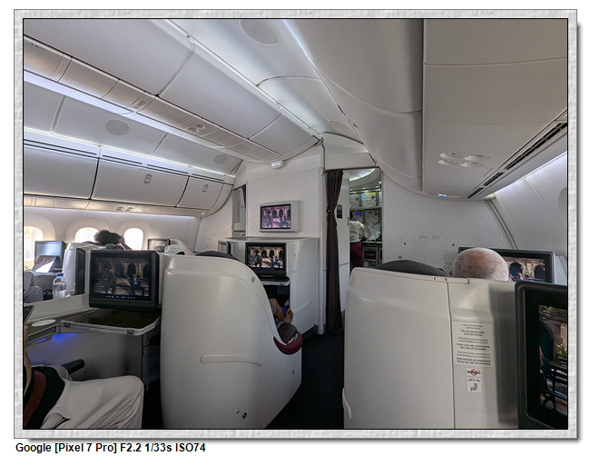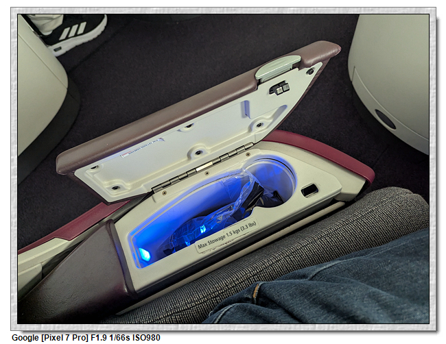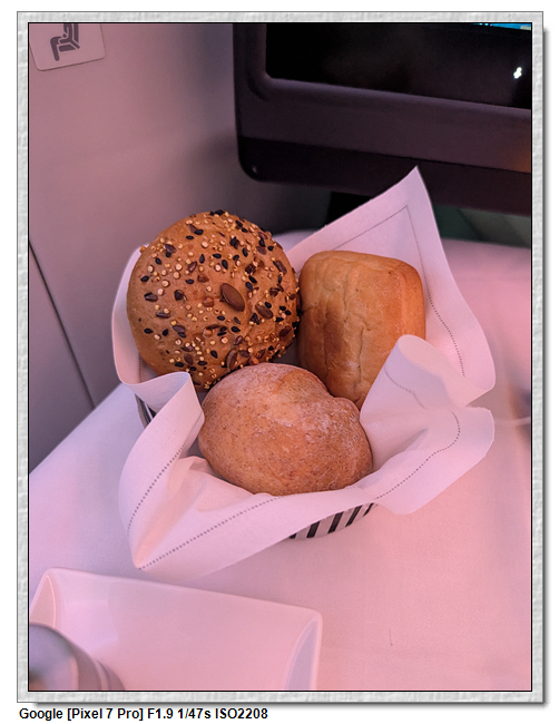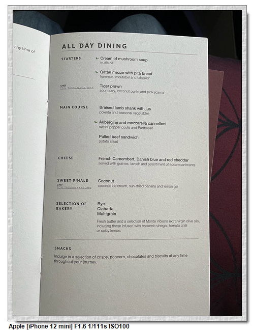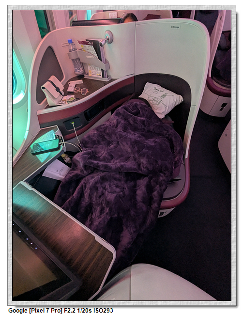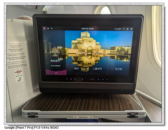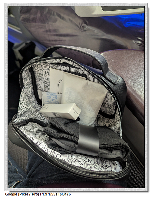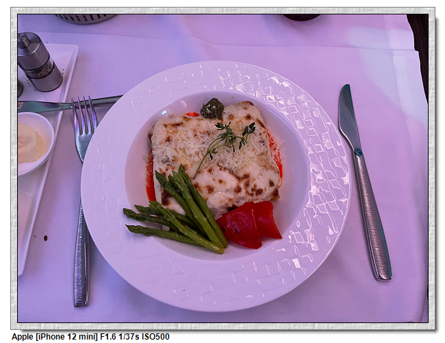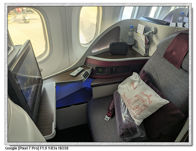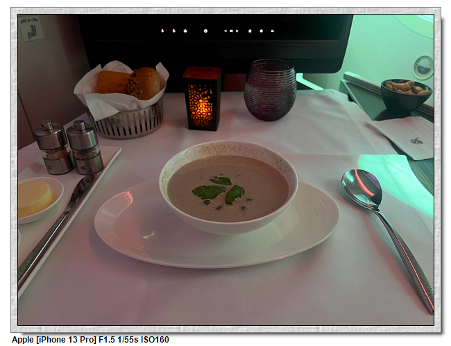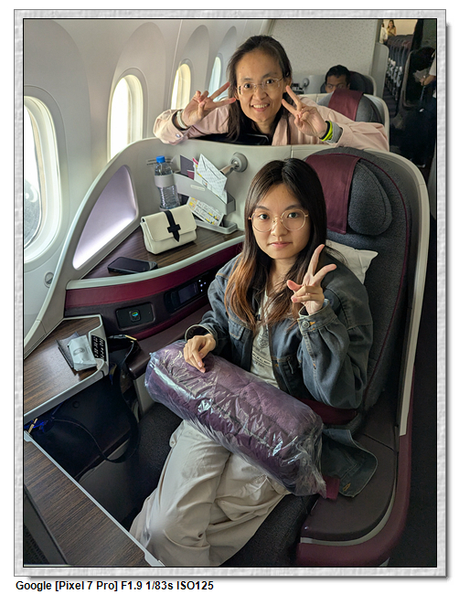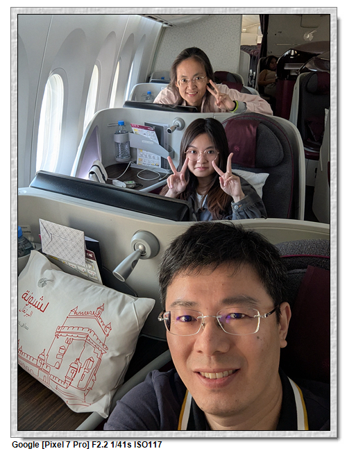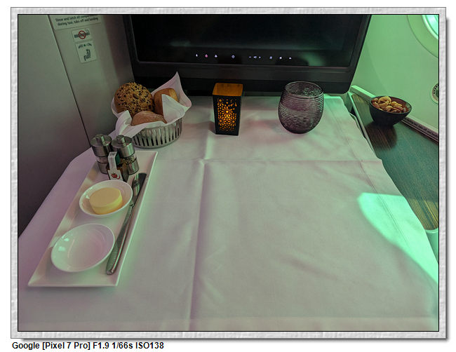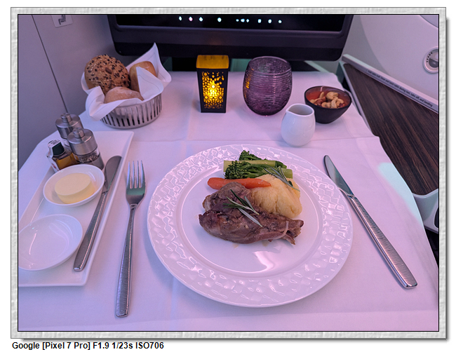 第一次坐商務艙,感到很新奇,很像鄉巴佬似的對於每個物品都很好奇,空服員還有詢問是否要睡衣,我們是拒絕了。商務艙的空服員看起來沒有經濟艙的忙碌,經濟艙的空服員都一直快速地走來走去,而商務艙的空服員就很有耐心的介紹餐點以及座位的用品(聽不懂也會盡量用簡單的單字解說),真的是一個座位一個座位的講解。 商務艙的座位大小應該有4-5個經濟艙的空間,當然這也反映在價格上,但如果把空間與價格相除,似乎也沒那麼貴了。起飛後大約一小時開始用餐,但也可以選擇想要用餐時再用,我看身旁其他旅客都是飛到一半時才用餐(3小時)。用餐也很有儀式感,會先鋪上桌巾,擺上餐具,還有小電子蠟燭,感覺就像是到餐廳用餐一樣。