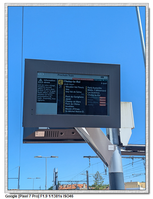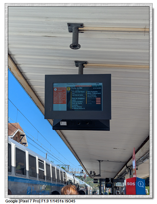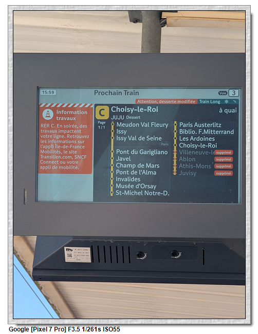 正當坐著有位子坐但卻沒空調的列車,一切順利準時發車時,突然開到Chaville - Velizy車站停了下來,然後車上廣播說了一些話,之後全車都下車。一開始只是以為有乘客要下車,但隨著車上的人越來越少, 我們意識到是全車都要下車。我們也搞不清楚的下了車,跟著人群走到另一個月台,然後發現怎麼大家都不見了,好像搭了另一台車走了。還好還是有一群人跟我們一樣搞不清楚的繼續等下一班車。