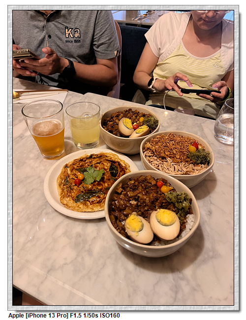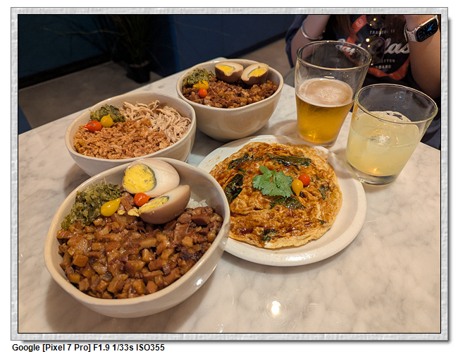 ▼【我們的餐點,滷肉飯、雞肉飯、九層塔蛋,微黃的飲料是檸檬酒】