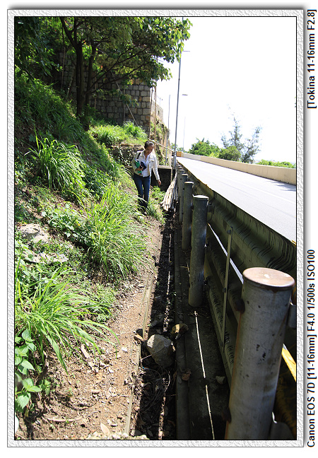 一開始先沿著馬路行人步道,一開始路旁有住家,走著走著,住家變少了,平路也開始變上坡。從有行人步道,走到沒行人步道,還走到沒路。重要的是,因為兩旁沒住家,所以也不會有公車站,也沒看見計程車 ,只好埋頭一直走。