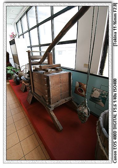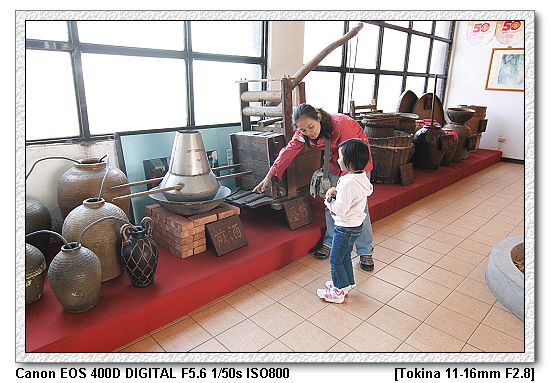 接著接待人員開始介紹展示館內所陳設的物品。中間走道所擺設歷年來酒廠很有特色酒瓶之外,四周皆有傳統釀造老酒過程以及器具。