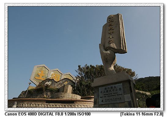 在馬港天后宮附近,有間具有特色的學校。校名牌是一隻手拿本書,後面則有國軍的文宣口號,整個畫面組合起來很特別。