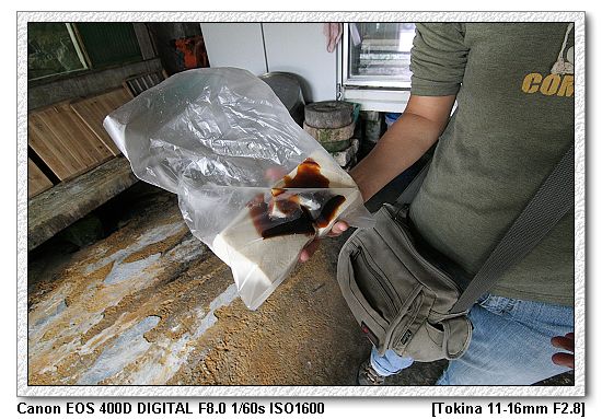 阿婆馬上拿了兩塊豆腐裝在塑膠袋裡,又要了點醬油。
