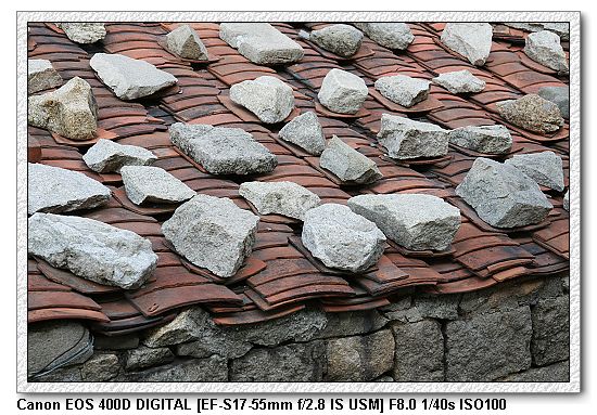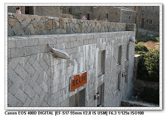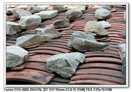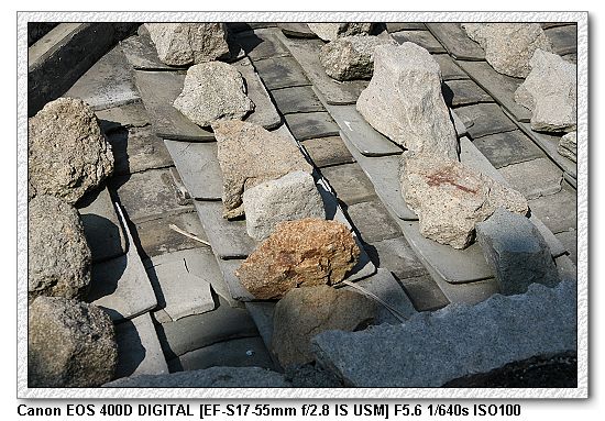 北竿在冬季時,東北季風強烈,因此每間石頭屋上都會有塊石頭押住瓦片,主要是怕強風把瓦片吹走,每間皆如此,形成有趣的景象。