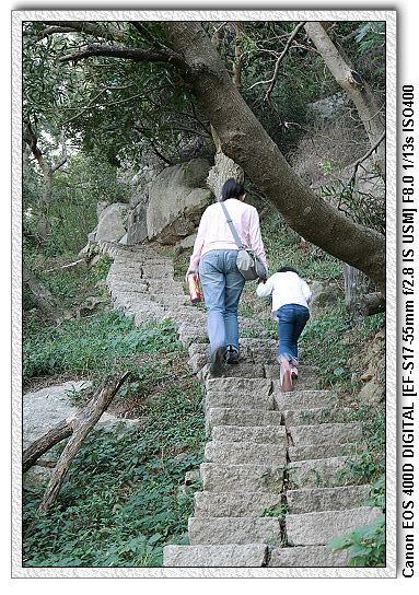 壁山建有三條步道(另兩條不知在哪),我們走的是最近一條,也就是從連接塘岐的登山步道,石階將近千階,登頂後,卻可以體驗所謂「登壁山而小天下」之暢快。小羽 沿路自己走,都沒有喊累。看來常去飛鳳山是有差的。