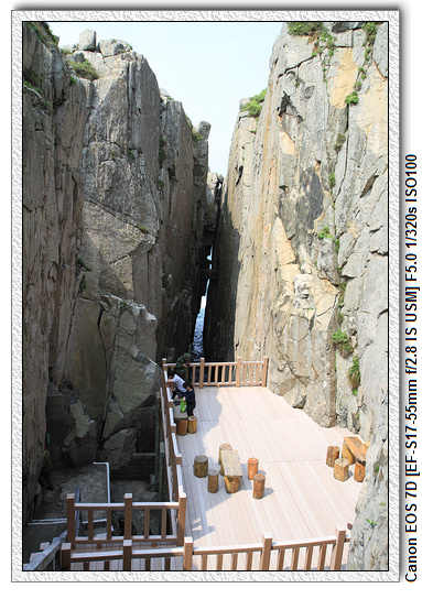 一線天也是在烈女義坑旁附近。一線天為一處海蝕溝地形,底部海浪拍擊石塊,如萬馬奔騰之音。