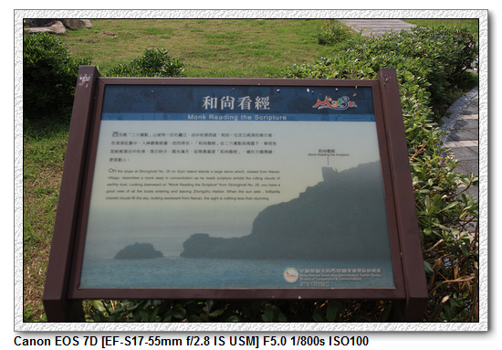 忠誠門前方有的小公園,是觀看景點和尚看經的好地方。和尚看經是一巨石矗立,由中柱港西望,宛如一位定力高深的修行者。