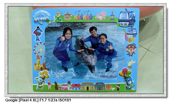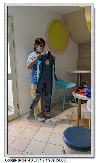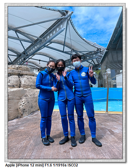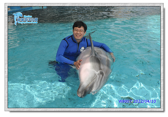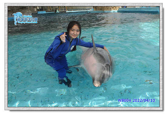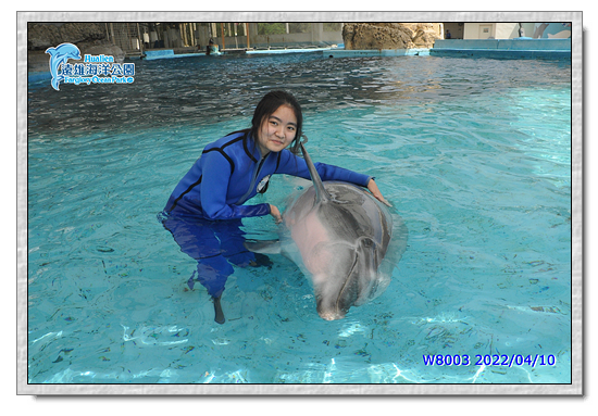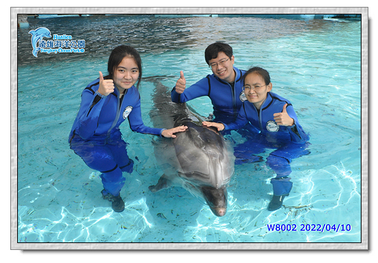 親親海豚是重頭戲,要換上防寒衣與海豚互動,為了怕海豚誤食,所以要脫下身上所有飾品以及手錶,也不能攜帶拍照器具,但可以在外面側拍。因為我們三人都要下水,所以我們有加購拍照的服務以及多購買電子檔。