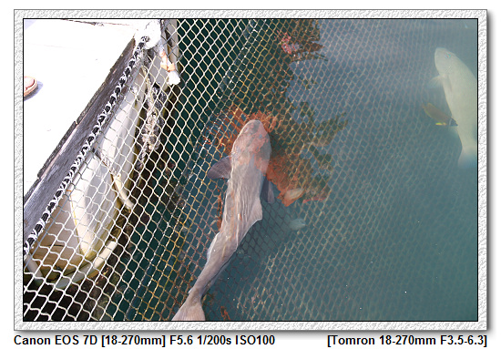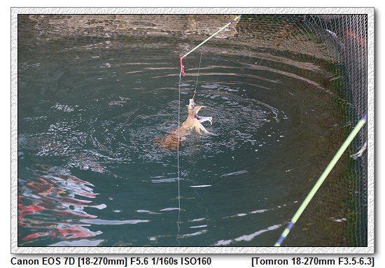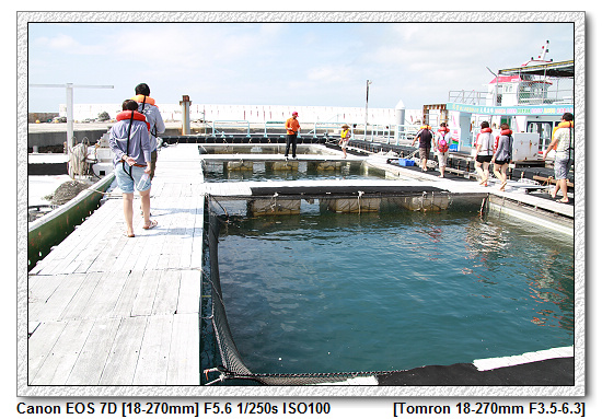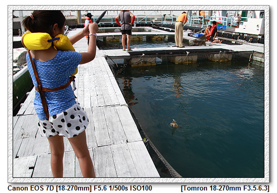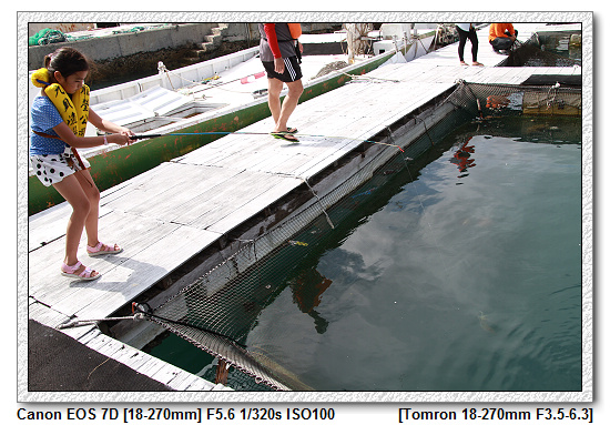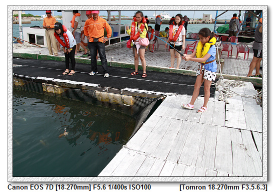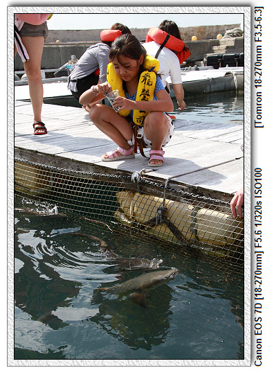 餵魚就是拿著小魚乾,在水面上晃呀晃,等待飢餓的魚上門。因為海鱺體型不小,所以轉身時會濺起水花,不小心會被濺滿身。