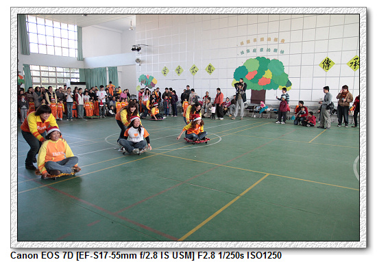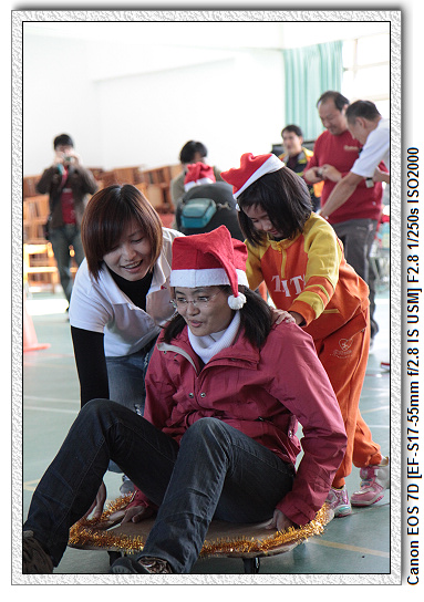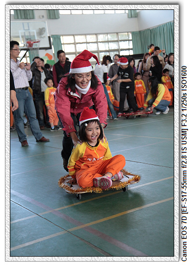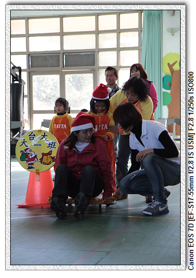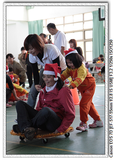 第二項遊戲是聖誕老人進城,是藉由小推車,一人坐一人推的遊戲,一開始小羽想要跟小羽爸一起玩(因為怕小羽媽不會推),後來看到示範有一段是小朋友推爸媽,小羽就反悔要跟小羽媽玩(怕推不動小羽爸)。