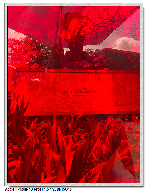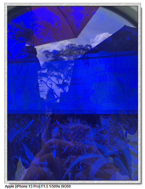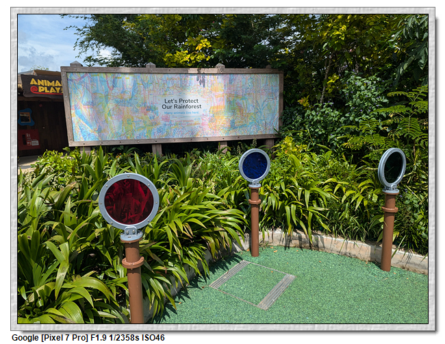 ▼【這個裝置很有趣,透過不同顏色的濾鏡,讓後方面板呈現不同圖案,有破壞森林與茂密森林的圖案,但陽光太大,拍不出來】