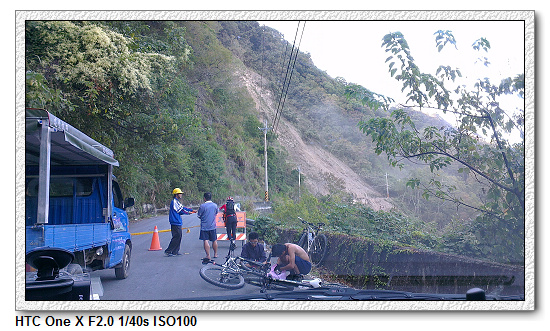 【回程時,遇到落石封路,前方三位年輕人是騎鐵馬上司庫】